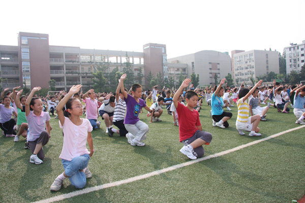 | 初一年级的同学们进行军事训练、学习健功操 |