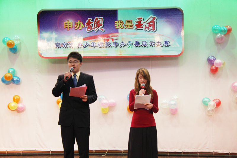 | 比赛开始之前,团市委副书记郑玲玲致辞。郑书记希望同学们以“永远争第一”的信念,赛出风格,赛出水平,向全国、全世界青少年展示南京市青少年的精神风貌,为南京申办青奥加油。 比赛分为申办陈述环节、DV展示环节和互动提问环节三部分。选手们从南京优秀的历史文化传统、优美的人居自然环境、优良的城市人文素质、优异的体育竞技成绩等各个方面,以青少年视野,为南京申办青奥进行了陈述,并展示了同学们自己动手制作的各具特色的DV。 此次比赛我校选出高三年级的陈乾、智奥亮和高澍雨三位同学,他们分别模拟南京市市长、国家奥委会官员和青少年形象大使,在比赛中用英语进行申办陈述,高一和高二年级的部分同学组成亲友团观摩此次比赛并为我校选手助威加油,校园电视台热情参与并制作了参赛DV。同学们通力合作,发挥各自的优势,在比赛中赢得现场评委和观众的一致好评。经过紧张角逐, 我校和金陵中学、江苏教院附中代表队等3个代表队获得一等奖,同时还获得了最佳陈述代表队、最佳DV制作代表队2个单项奖。 比赛后,金陵职教中心的藏族青少年朋友们现场为观众们表演《青春踢踏》,向南京市青少年展示了藏族青少年们用汉、藏两文字签名的参与、支持南京申办青奥的祝愿。 模拟申青奥比赛,让青少年亲身参与申办青奥,增强了百万青少年对于“让奥运走进青年,让青年拥抱奥运”申青奥理念的理解和认同,表达了对2014年第二届青奥会的热烈期盼。 |
