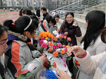 此之前,学校初二年级的600位同学亲手制作了精美的纸质鲜花,这600朵凝聚爱心的花朵,将在义演