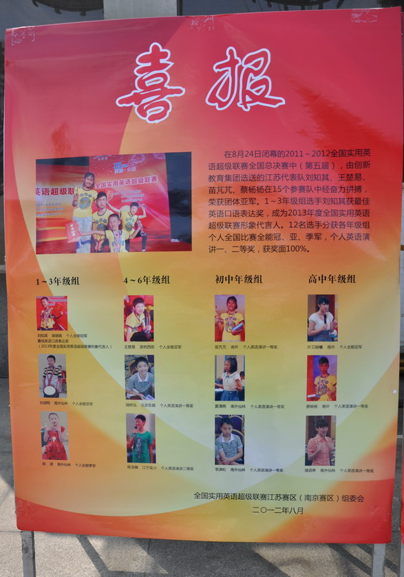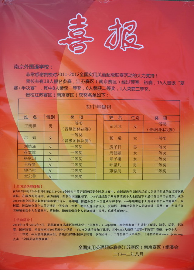 在2011-2012全国实用英语超级联赛中,我校初中部共有18人报名参赛,江苏赛区经过预赛、初赛,15人晋级“复赛+半决赛”,其中8人荣获一等奖,6人荣获2等奖,1人获三等奖。