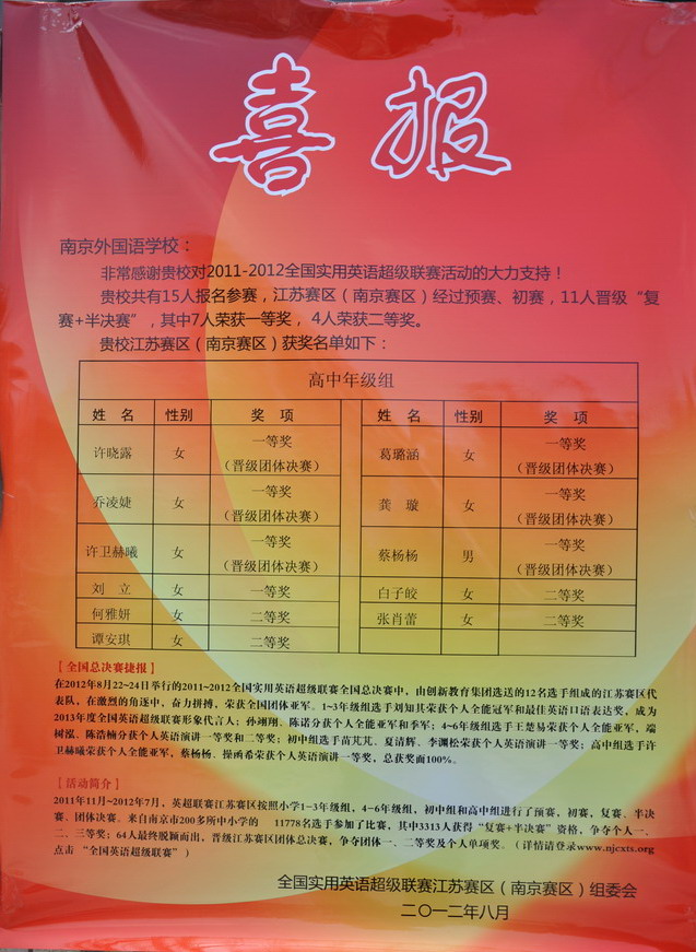 在2011-2012全国实用英语超级联赛活动中,我校15人报名参赛,经过江苏赛区(南京赛区)预赛、初赛,11人晋级“复赛+半决赛”,其中许晓露、乔凌婕、许卫赫曦、刘立、葛璐璐、龚璇、蔡杨扬7人荣获一等奖,其中许晓露、乔凌婕、许卫赫曦、葛璐璐、龚璇、蔡杨扬还晋级团体决赛;何雅妍、谭安琪、白子皎、张肖蕾4人荣获二等奖。另外,许卫赫曦荣获个人全能亚军,蔡杨扬、操函希荣获个人英语演讲一等奖。