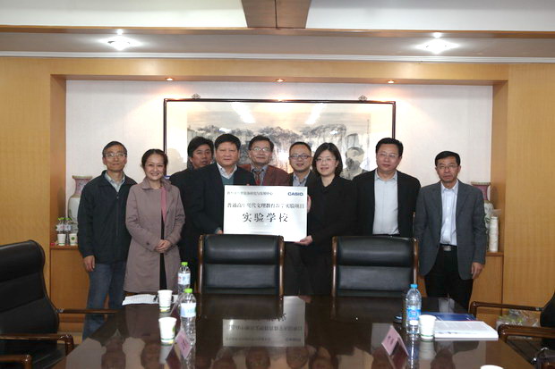 会议由周弋副校长主持。会上卡西欧公司代表首先就外语、数学及音乐等关联学科向到会人员做了研究介绍,向大家展示了现代电子产品在激发教师教学智慧、成就学生自主学习方面所起到的巨大作用,并向我校捐赠了45台数学计算器、45台电子辞典、一台电子投影仪和一架数码钢琴作为项目启动设备。捐赠仪式之后教育部基础教育二司技术装备处乔玉全处长、教育部教育装备研究与发展中心科研处陈琳副处长、省教育厅教研室何锋书记、省教育装备与勤工俭学办公室刘丰书记、市教育装备与勤工俭学办公室后有为主任及我校董校长分别从不同的角度阐述了此研究项目的重大意义。我校将合理分配、使用这批电子设备,力求能借此项目拓宽教师们的授课思路,增强学生们的学习效率,获得更好的教学效果。