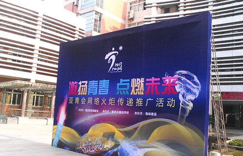 南京亚青会将于5月8日迎来倒计时100天和网络火炬传递启动仪式。昨天(5月2日)下午16时,名为“激扬青春 点燃未来”的亚青会网络火炬传递推广会在我校体育馆隆重举行。