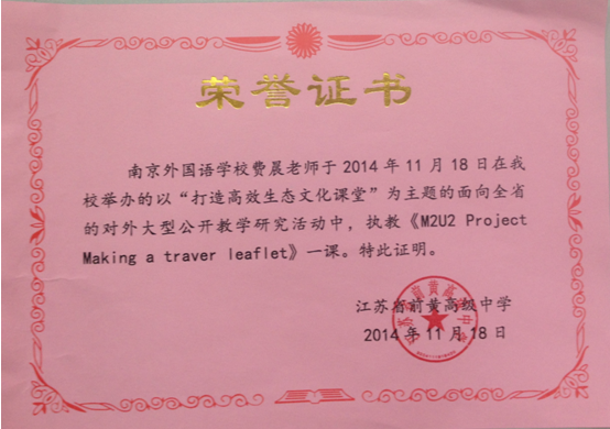 我校高一英语组费晨老师于2014年11月18日受邀参加江苏省前黄高级中学举办的面向全省的对外大型公开教学研究活动,主题为“打造高效生态文化课堂”。费晨老师对来自全省近六十位老师开设了一节高一年级的阅读-写作公开课——“牛津高中英语第二模块第二单元Project Making a Travel Leaflet”,课堂教学中引入新颖、过程流畅,与该校高一(3)班50名学生充分互动、气氛热烈,收到良好的教学效果,受到广泛好评。