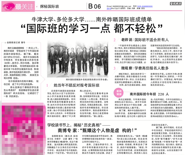 南京外国语学校国际部昨天传来捷报:剑桥国际高中和IB国际文凭课程班2015届毕业生115名同学共获得来自世界各国知名院校的录取通知书499份。其中,吕玮琪被剑桥录取,潘悦嘉被牛津录取。两个清秀的小女生还双双获得2013年剑桥国际考试委员会组织的剑桥IGCSE附加数学全球最高分。记者昨天详细采访8名南外国际班学霸代表,他们的经历可能完全颠覆很多家长和孩子对国际班的观念。