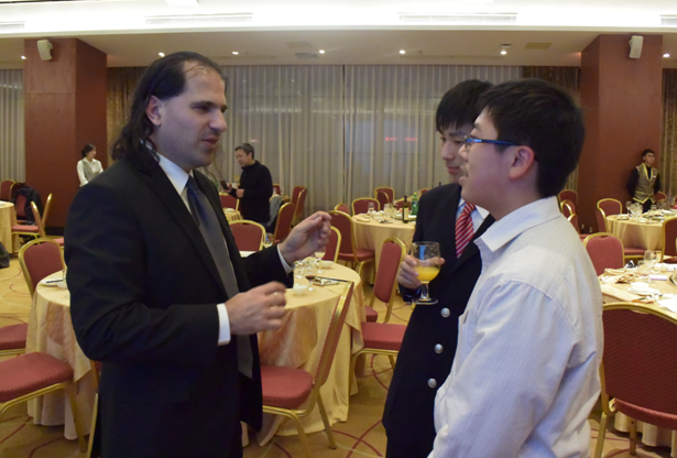 赵亮(右)和张泽夏(中)同学在颁奖答谢晚宴上与物理学家尼玛热烈交流