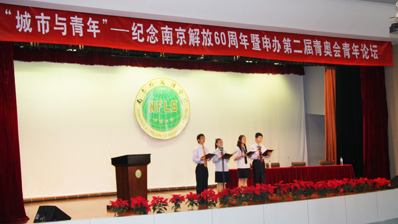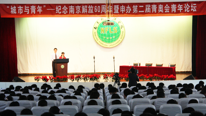 为纪念南京解放六十周年,积极宣传南京申办第二届青奥会,4月22日上午10点,南京外国语学校的高三学生在报告厅组织开展了一场“青年与城市”的论坛活动。论坛以南京的历史、现在和未来三大板块为序,糅杂知识普及、经历讲述、观众参与、同学演讲和诗朗诵等形式,回顾南京60年沧桑巨变,引导青年明确责任,激发青年奉献精神。