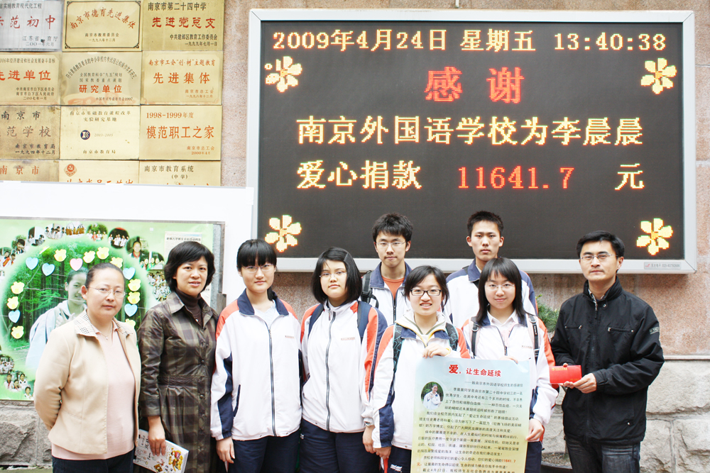 4月24日下午,高二年级的组织者,学生会代表及校园电视台成员前往了二十四中,进行了捐款和祝福的移交。晨晨的班主任史菁老师以及二十四中的校长、书记接待了我们。他们告诉我们,社会各界已为晨晨募集爱心捐款超过22万元。在全社会各界的关心下,晨晨目前已住进南京军区总院进行化疗,病情逐步稳定。