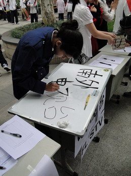 在13日中午仅有的40分钟招新时间里。各个社团的招新人员都卯足了劲摇旗呐喊,招纳社员。社团之间的竞争也显得越发激烈。由于今年参加招新的社团大大超过往期,各个社团招新点的面积也相应减少了许多,但面积的减少并没有影响社团丰富的招新计划。音乐社为了增大场地的面积巧妙地利用了电梯间入口的台阶,席地而坐,用歌曲联唱的方式招募社员的加盟。国风社的成员则充分地运用了纵向的空间,把社团的特色发挥地淋漓尽致。