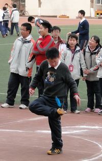 随着裁判员一声哨声,踢毽子比赛正式开始。操场上随即响起此起彼伏的加油声,各