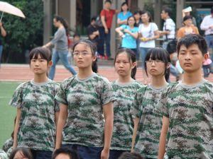 早晨,我们背起行囊来到了中国人民解放军理工学院。我们刚放下行李,教官让我们排成方队并宣布了军队的纪律,他说:“我就是你们八连的教官,在这里你们已经不再是学生,而是一名军人。在队伍里站直了,不要乱动,动一下打报告,这是对教官最起码的尊重。”我看着教官笔直的站姿,让我肃然起敬。在“学员路”上,我们站得笔直,双手紧贴裤缝。在靠草丛的地方,蚊子找上了我们,我们仍能“站似一棵松”,动作不规范的地方,教官会严厉地指出,毫不留情。有时我们站到脚跟已经没有知觉,一闲下来会觉得小腿酸疼,我们都没有怨言。就这样,“站”的功夫初见成效,瞧,一排排整齐的队伍在路旁小树的映衬下,显得更加挺拔,俨然成了一道道风景线。
