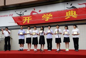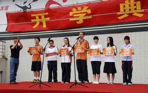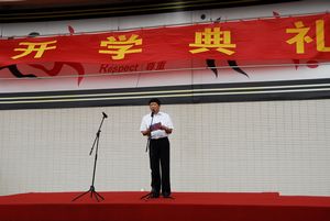 2011年8月31日,我校2011-2012学年第一学期开学典礼在操场上如期举行,持续几天的阴雨终于散去,阳光洒在所有师生的脸上,学生处吕燕主任主持开学典礼,董校长做了发言,充分肯定了老师和同学们上一学期所作出的成绩,并号召全校师生脚踏实地、仰望星空、更创辉煌。