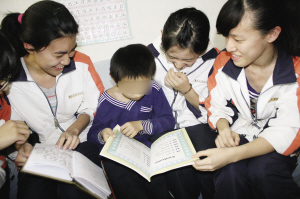“六七岁的无拘时光,不适合因为羞怯或自卑放弃对知识的渴求,如果宁宁小朋友的生活暂时不那么明媚喜人,那么让我们携起手来,帮助他、鼓励他、给他知识,给他友情,也给他关于明天的自信……也许我们不是最称职的老师,但我们一定是最衷心与最耐心的听众,教他踏出迈向世界的第一步……”这是南京外国语学校高三(8)班的全体学生,为他们全班共同帮助的一名“自闭”孩子建立的“辅导日记”的卷首语。在这个班42名孩子的爱心接力下,住在兰园社区8岁的宁宁(化名),已经取得了很大的进步。