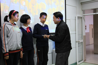 11月22日,在“校友许吉如APEC归来交流会”上,初二同学们在认真聆听许吉如、陆韬羽两位学