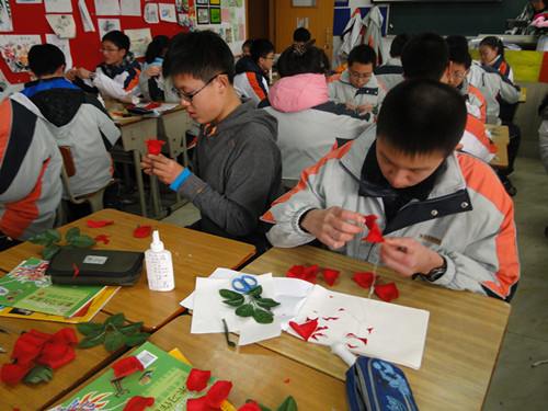 下图为同学们上课认真做花的场景
