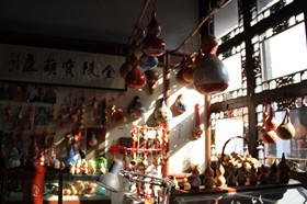 这里周末的人流并不算多,甚至可以算得上冷清。在院落中隔出的小屋内,艺人们正忙着手里的伙计。除了传统的葫芦、抖翁制作外,我们还新奇地发现了缂丝、点画等几经失传的技艺。老艺人们都很好客,一位画国画的老爷爷随手拿起一张宣纸就开始向近旁的两位小学生