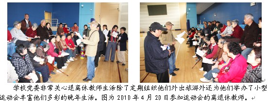 重视退离休老同志工作。为保证工作落到实处,建立了领导负责、分工明确、联络方便的网络体系。党委主要负责同志直接分管,安排专人具体负责日常工作。广泛征求退离休教职工意见,制定了《南京外国语学校退离休教职工工作条例》,分别就加强领导、支部建设、退教协作用、开展活动、生活福利等方面都做出具体规定,提高了工作的规范性和计划性。精心举办重阳节祝寿会、迎新年茶话会、老年运动会、春游、秋游等多种活动,老同志普遍感到心情舒畅、生活充实。