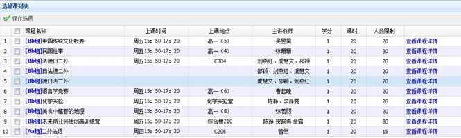 对于选修课,所有的选修课程都所属一个分组,每个分组有“大类”(A~ C组)、“小类”(a、b)两个基本属性。a为周四上课,b为周五上课,故学生在选择选修课时,不可以选择分组小类一样的课程,也不可以跨大类分组选择