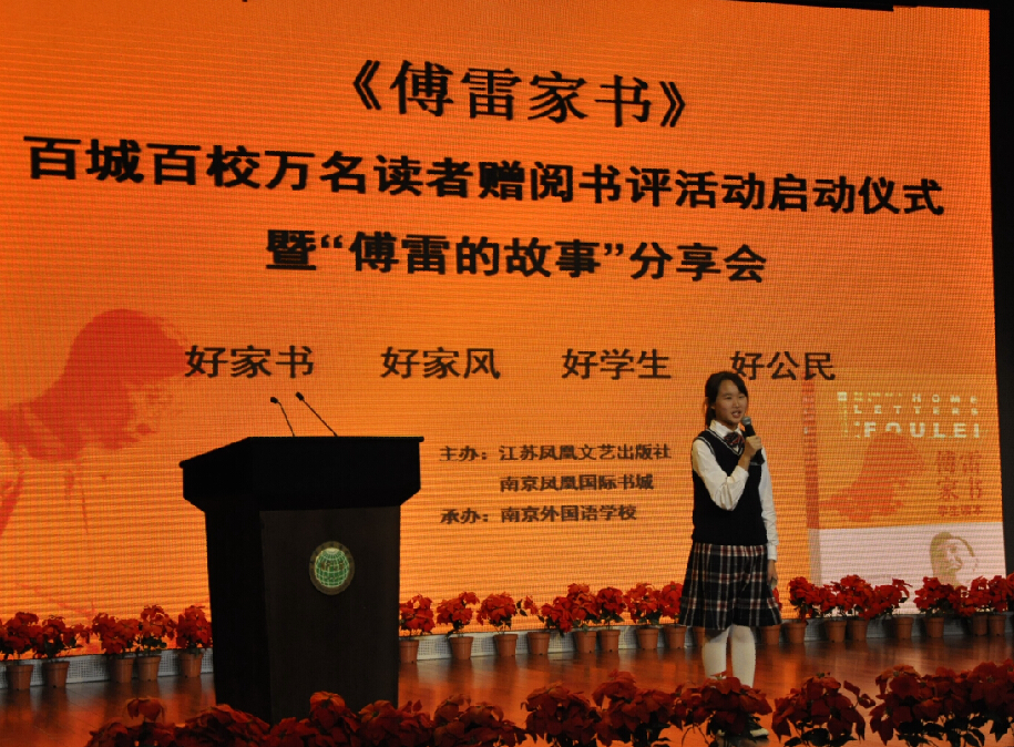 2015年11月18日,我校第二十八届读书节暨《傅雷家书》百城百校读者赠阅书评活动启动仪式在我校报告厅举行。参加本次启动仪式的有出版界、书城的朋友,来自新闻界的记者,以及我校的部分师生。精炼而热烈的仪式,包含了微课、朗诵、读书心得交流等环节。赵思达老师饱含深情地给同学们讲述了傅雷的生平和风骨,来自江苏文艺台的主持人孙达先生现场朗诵了一段家书,初一11班学生李彦均结合自己所受的家庭教育经历谈了自己阅读傅雷家书的体会。整场活动文化气息浓郁,富有教育意义。