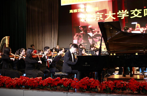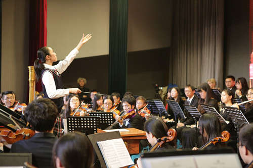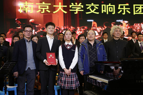 为让同学们更好欣赏音乐会,吕老师在每支乐曲演奏前均介绍乐曲的主题和特色。第一首气势磅礴乐曲《匈牙利舞曲第一号》在他的的指挥下就征服了观众,一下子就把现场气氛调动起来!音乐会第二个高潮是本场第二个指挥登场,她就是来自我校初二(2)的邹沛文同学,据悉她是目前南京中学生指挥交响乐团的第一人,小小的指挥棒在她手中娴熟地上下翻飞,整个乐团和她指挥配合非常默契,当她指挥的《第一交响序曲》终了,掌声雷动,而她也非常专业地和乐团首席琴手握手致谢。音乐会最高潮是校友鞠小夫的登场,鞠小夫今年刚从南外初中毕业,免试进入上海音乐学院附中学习钢琴专业,这是他首次回母校演出,演奏曲目是难度极大的《黄河协奏曲》,这首乐曲分四个篇章,长达20分钟,只有专业级水平才能完成。“自古英雄出少年”,现场这两个少年音乐家相得益彰,将整场演出带入最高潮,台下的观众也是如痴如醉。吕老师当场颁发了他们“南大交响乐团客座演奏家和指挥家”证书,让同学们大开眼界。音乐会最后一曲是同学们非常喜爱的《加勒比海盗》乐曲,在邹沛文的带动下,全场同学合着乐曲打起节拍,台上台下成了欢乐的海洋。