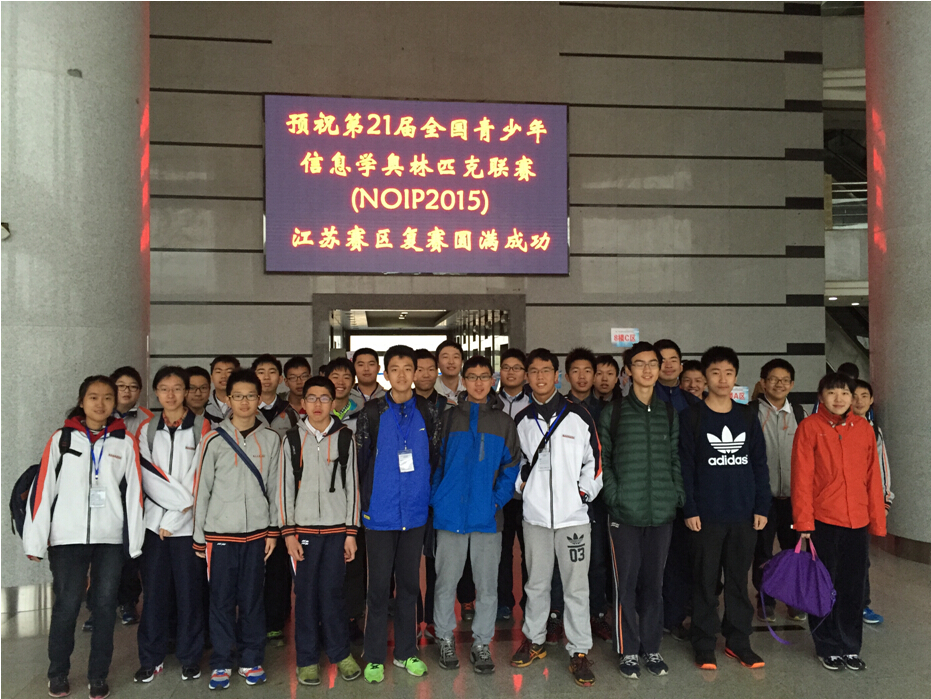 在11月7日、8日举行的全国青少年信息学奥林匹克竞赛(NOIP2015)江苏赛区比赛中,我校共有20人获得提高组全国一等奖(人数为全国第六,江苏第一),36人获得提高组江苏省一等奖,赵心怡同学获得提高组最佳女选手称号。普及组方面,有9人获得全国一等奖,24人获得江苏省一等奖。