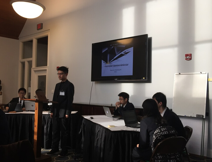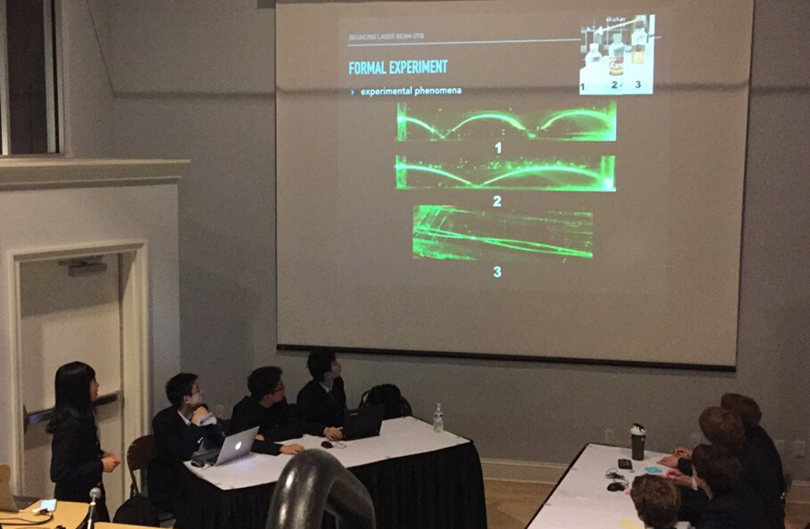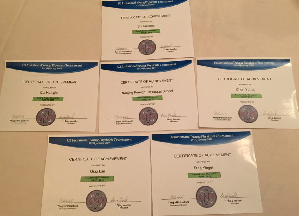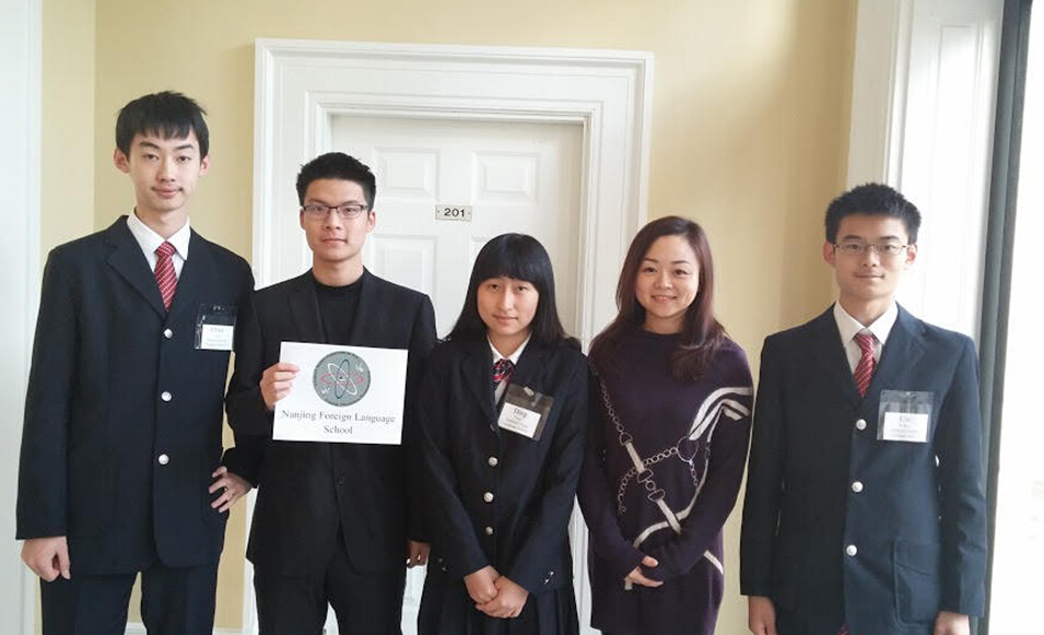 2016年1月29、30日,我校乔兰老师带领高二年级的“丁英芪,陈宇豪,蔡康嘉,石睿康”四位同学在美国华盛顿附近的林奇堡兰道夫学院参加了“第九届美国青年物理学家辩论赛”(USAYPT),在这几天充实而紧张的比赛过程中,四位同学通力合作,沉着应对,积极表现,在赛场上展现出了南外人的风采,受到各位评委的好评。最终丁英芪同学,以她严谨的理论及模型分析,精妙的实验设计,丰富的实验数据,细致科学的数据分析,再加上她自然亲和的交流态度,取得了“海报”比赛环节的全场最高分,斩获了“2016年USAYPT”的海报冠军奖!(Swartz Poster Champion USIYPT 2016)