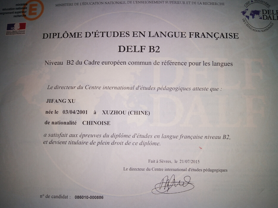 2015年7月 初二法语班许荠方通过考试获得欧标B2等级文凭,这是法国及加拿大对国际学生本科入学所要求的法语语言文凭。