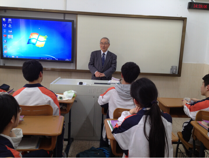 4月14日下午中国传媒大学南广学院日本专家河合正男先生在市外办亚洲处处长孙曼的陪同下来我校参观访问。参观了高二年级韦珏老师的日语课,并给学生作了简短讲话,之后参观了校园。河合先生是日本资深外交官,曾担任过挪威、驻文莱等国大使职务,是对华友好人士。
