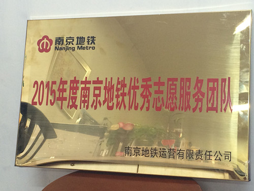 2016年4月19日,南京地铁运营公司举行了“2016年南京地铁志愿者工作表彰暨志愿者骨干培训大会”,肯定了包括我校在内的10个地铁志愿者团队,在过去的2015年里优秀的服务表现。大会中,南京地铁运营公司对各校给予的大力支持表达了诚挚的感谢,对各校志愿者进行了高度评价,赞扬所有志愿者牺牲了自己的休息时间到车站一线进行志愿服务,认真工作、坚守岗位,为南京地铁的正常运营保障做出了突出贡献。