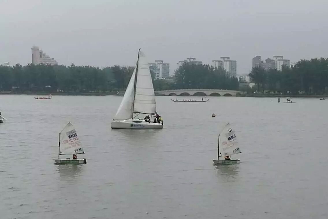 2016年6月4日是一个值得纪念的日子, 南京运动会第一次加入了帆船对抗赛项目。而我,很荣幸地成为第一批参加对抗赛的选手之一,这也是我第一次参加帆船比赛。早晨,玄武湖上烟雨弥漫,湖边帆船俱乐部附近围满了参加op级帆船的小朋友们,几十艘op级小帆船在湖面上漂着,场面壮观。说来也许会引起他人的“嗤之以鼻”,相较op级小帆船而言,因为是第一届“大帆船”对抗赛,参赛队伍只有4支,分别是树人学校的两支队伍和南外的初中队和高中队。