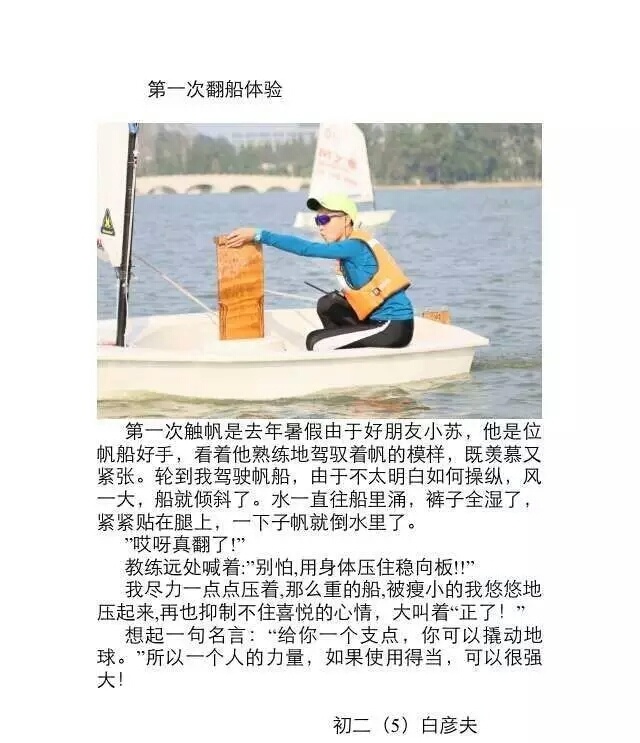 上午,我们初二四位同学代表南外与树人进行了一场帆船对抗赛。在此过程中,我深刻地领悟到了团队合作的重要性。作为右前帆缭手,我的职责是在帆船转向时收放撩绳,但这看似只需一人单独完成的任务却需要他人的配合。速度,精准度,力量都有很大需求。常常我会因为风力太大拉不动撩绳,而此时另一个前帆缭手便会跟在我身后帮忙,也因此我们帆船的转向速度很快,没有走出超过的航线,也没有绕远路。我们取得了胜利,却收获了宝贵的团队合作精神。