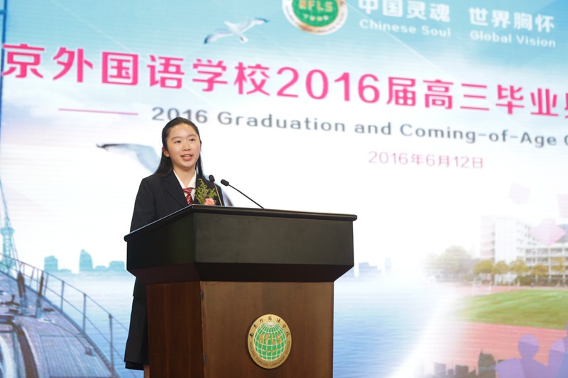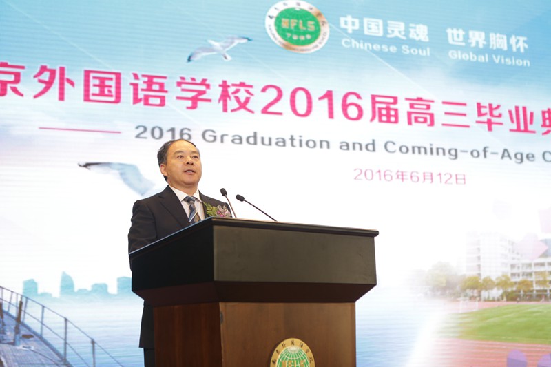 今天,是我们所有人的一个大日子,我们在这里隆重举行南京外国语学校2016届高三毕业典礼暨成人仪式。首先,请允许我代表学校向执教过2016届学子的所有教师致以最崇高的敬意!向高三所有的姑娘们、小伙子们致以最热烈的祝贺!向多年来关心、支持、信任南外的各位家长表示最诚挚的感谢!感谢你们,让我有机会和你们一起分享这美妙的时光。