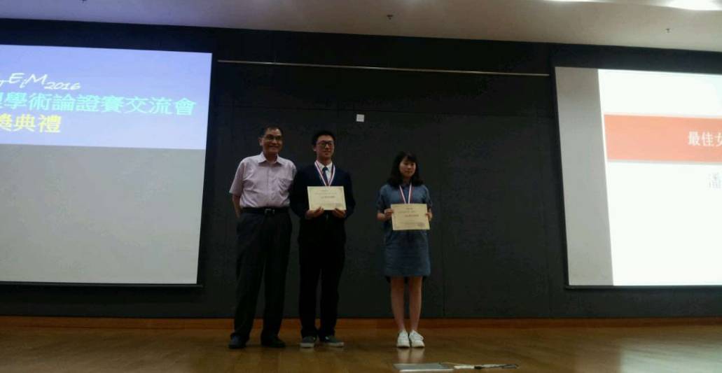 高一(4)潘开欣(右1)同学获得“最佳答辩奖”的个人最高荣誉