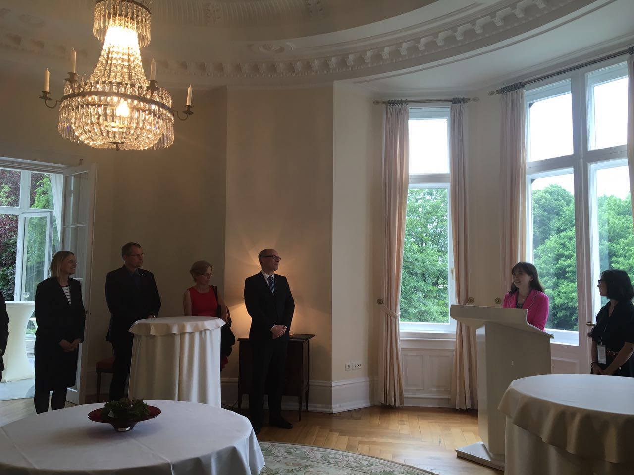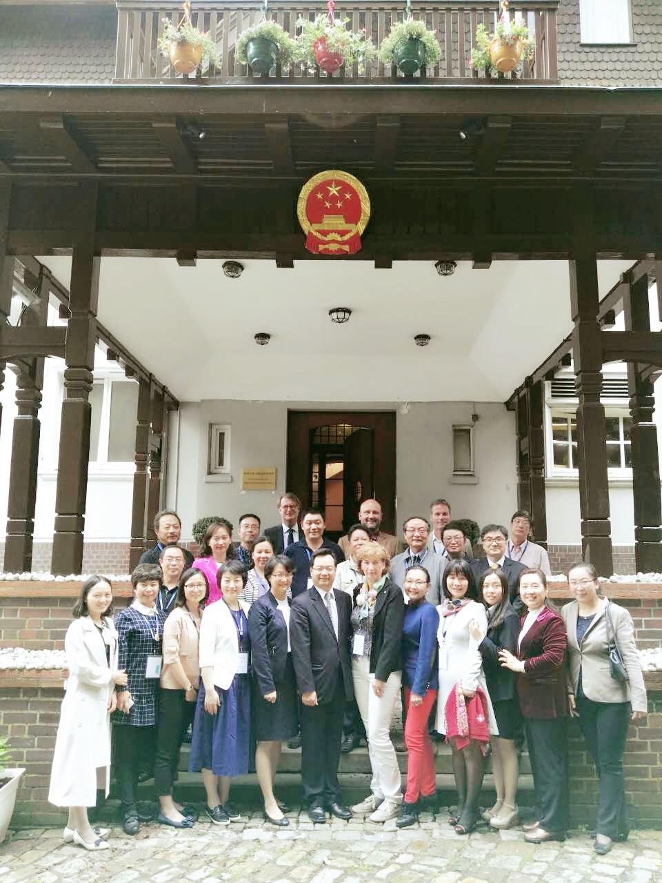 本次论坛得到了德国方面的高度关注。汉堡市教育局领导Burghardt Ahnfeld先生全程陪同,德国国外学校教育司官员Katharina Forth女士、德国歌德学院代表Votter先生、德国国外学校教育司总部Hass先生等均到会讲话。中方代表还受国务委员Wolfgang Schmidt先生邀请参观了汉堡市政厅。主管中小学教育的Ties Rabe议员则代表汉堡参议院邀请中方代表参加晚宴。本次论坛同时也得到中国驻德国汉堡总领馆的高度重视,副总领事楼了凡代表总领馆参加了参议院的招待晚宴,孙从彬总领事则在总领馆接见了所有到会代表。我校连凯副书记作为中方代表分别在参议院招待晚宴和领事馆招待晚宴上致感谢辞。