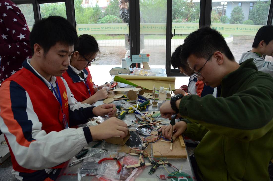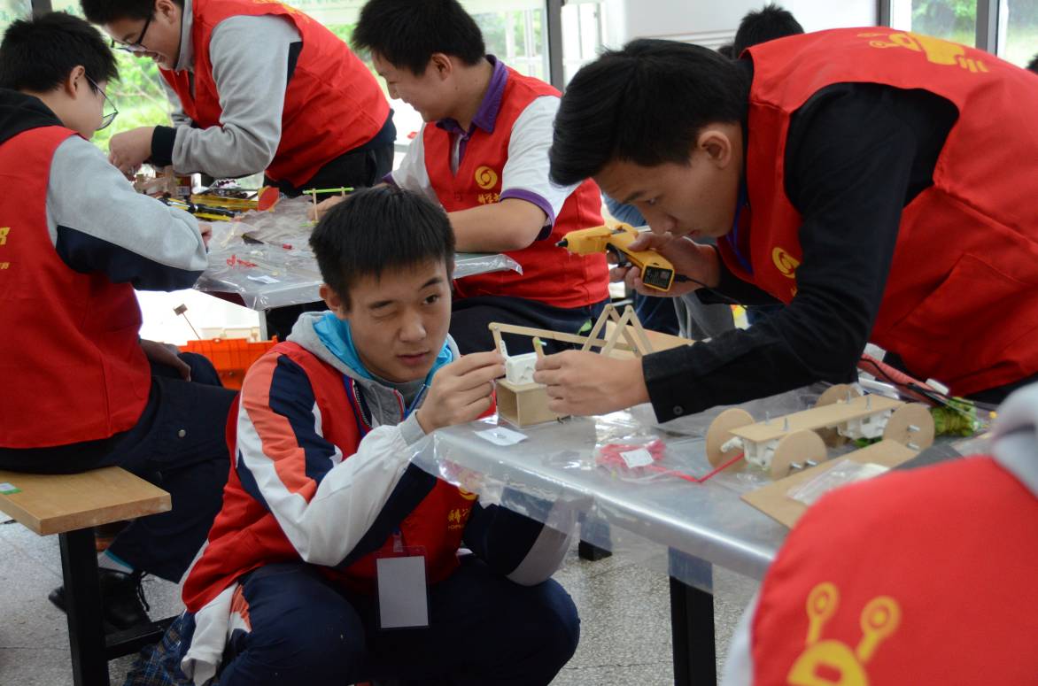 高三(4)魏央同学说:比赛造型我们采纳了仿生学原理,同时,我们想将外观设计与中国文化元素想融合。因此,木板、螺丝、变速箱、马达等搭成的简易小车摇身一变成了红红火火的锦鲤,象征友谊、幸福,“海阔凭鱼跃”,又代表我们中学生可以在自由的天地里发挥自己的才能,创造自己的未来。“虫虫危机”成为了一只高贵优雅的凤凰,涅槃重生,代表我们不畏艰险,也意为“天高任鸟飞”。“万兽之王”,则是一只威风凛凛的雄狮……。比赛时我小心翼翼地手捧作品,交至评委处,我整理好线路,按下了开关,“龙猫巴士”便立刻被镀上了色彩,五彩斑斓的小灯泡一齐闪烁。身旁的同伴拍手叫好,我也仔细欣赏着它,回想起训练过程的一点一滴……,感谢和我一起奋斗的同学们,感谢给我们提供诸多帮助的老师,这段经历,我不会忘记。