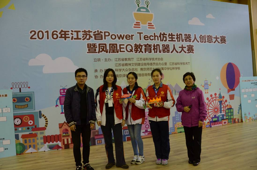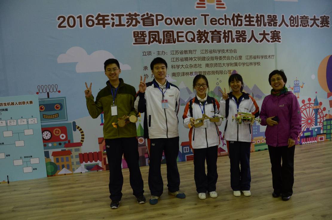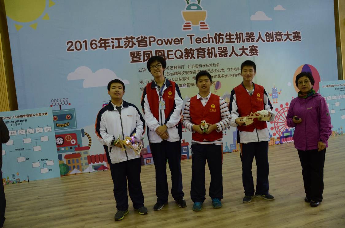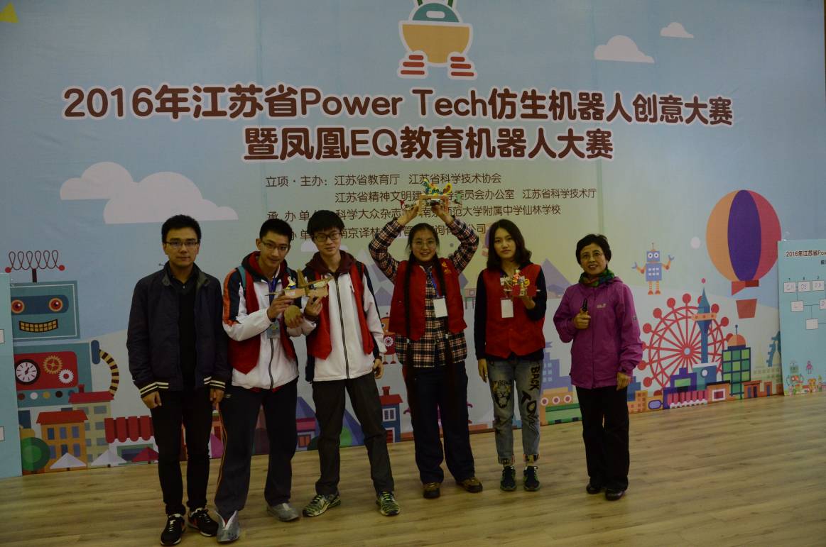 2016年10月29日江苏省Power Tech仿生机器人创意大赛,在南京师范大学附属中学仙林学校隆重举行,全省150个代表队参加比赛,南京外国语学校派出6支队伍参赛,这6支队伍中的24位同学,通过1个月的系统学习和刻苦训练,在2016年江苏省Power Tech仿生机器人创意大赛中,取得了较好的成绩。其中《东方红队》周玥辰、孙海皓、李湘中、沈昊诚获综合特等奖,创意一等奖;《超级战队》瞿灿洲、张楷中、王子懿、杜尔雅获综合二等奖,创意二等奖;《阿波罗尼斯队》王辉宁、李星泽、雷 铮、李陈诺获综合一等奖,创意一等奖;《king战队》秦子昂、李星科、吴加琪、李辰尧获综合二等奖,创意二等奖;《新概念队》张凌培、顾紫悠、庞志晨、庞頔阳获综合二等奖,创意一等奖;《萤草势力队》骆新翎、魏 央、王若、赵胤昊获综合二等奖,创意特等奖;领队兼总教练罗雪华、孙风波、罗洁华三位老师付出了很多很多。