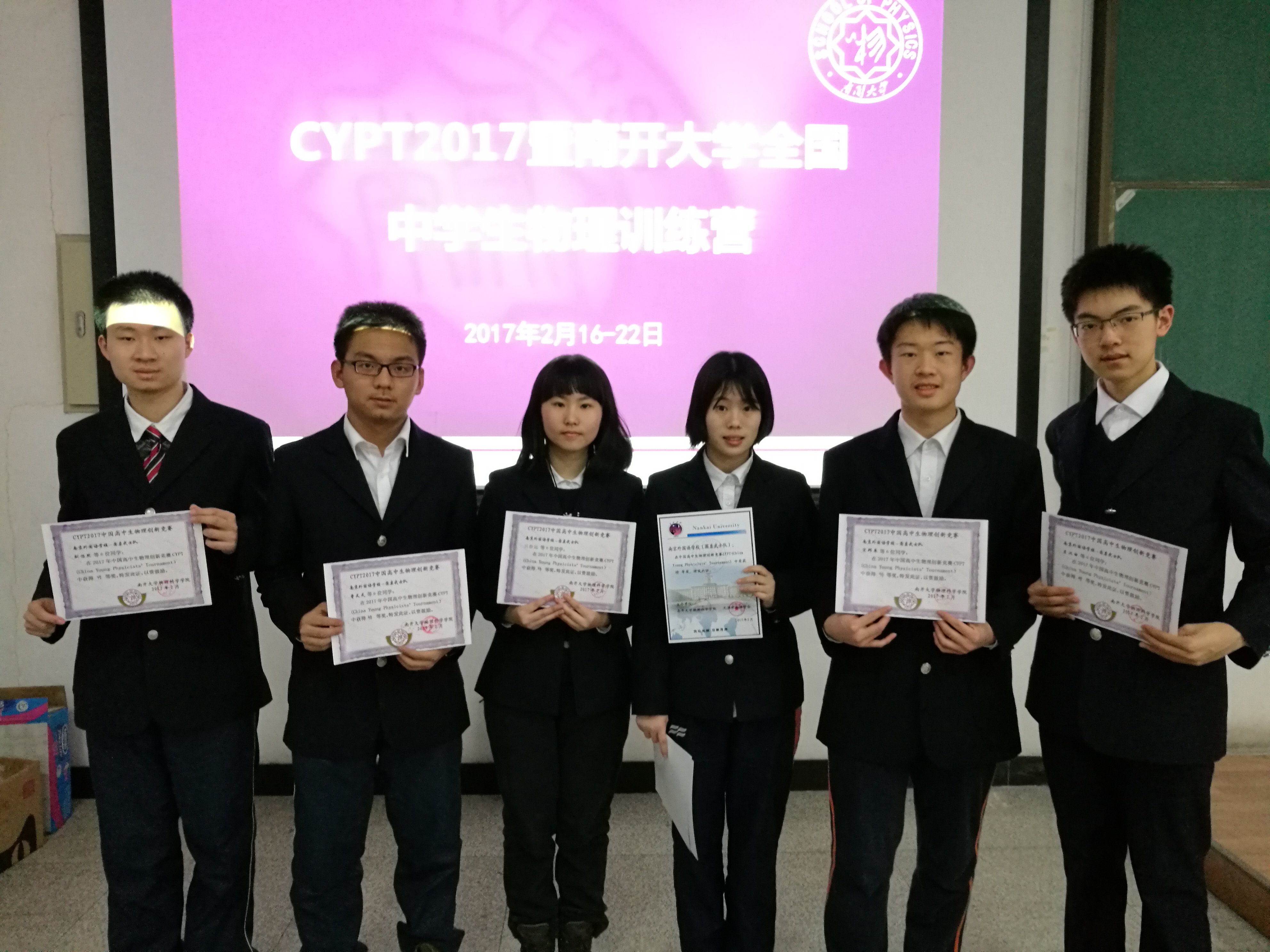 在CYPT比赛之后,南开大学举行了对于2017IYPT国家集训队的选拔英语及中文面试。我校同学表现出色,在理论笔试、比赛表现和中英文面试等诸环节中,各位学生的综合素质水平得到了充分的展现,为学校赢得了荣誉。经笔试和中文面试,我校有九位同学在南开大学全国中学生物理训练营中获“优秀营员”称号,将有机会享受南开物理学院自主招生降分录取,其中获得A等级有7位同学(全国共33人),人数位列全国第一;获得B等级的有2位同学(全国共55人)。最终刘怡然、潘开欣、吕汉白同学脱颖而出进入了IYPT2017中国国家集训队(12人),这充分说明了我校的学生在物理学术研究方面具有较为突出的能力。国家集训队还有来自青岛市第二中学、中国人民大学附属中学和江苏省前黄高级中学等学校的优秀选手。除了三位出色的同学,我校两位高一同学李心月、邢溱中在此次参赛中都展现了非常高的水平,得到评委教授的肯定,也为我校YPT的后备力量的培养奠定了基础。