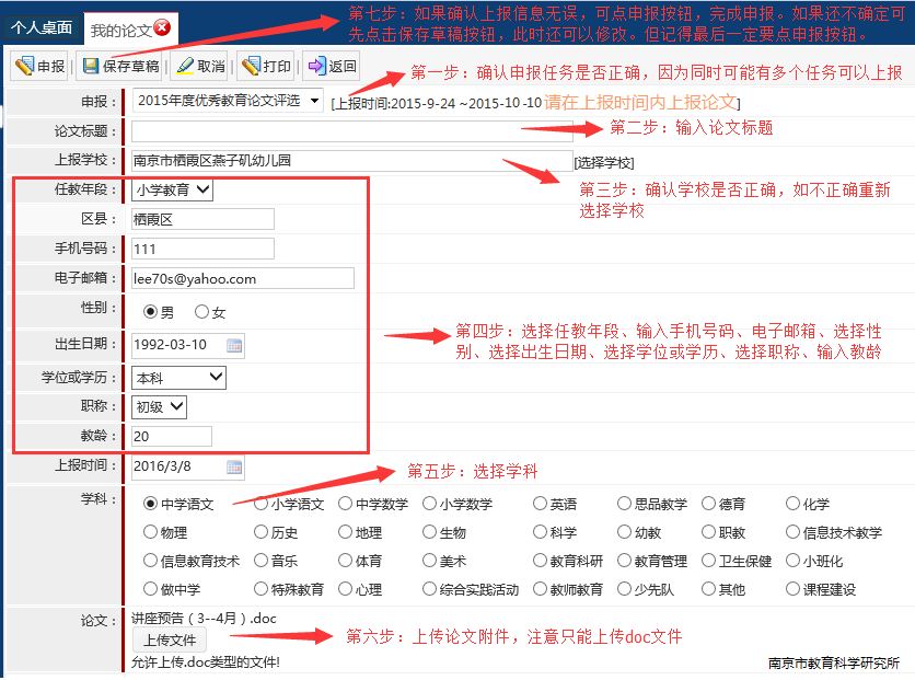 2.参评论文需在南京市教科所网站参加论文网报,网报生成的封面不需要打印,只需将自动生成的文章编号填于附件的封面。网报时间:201751日至530日(流程后附)。