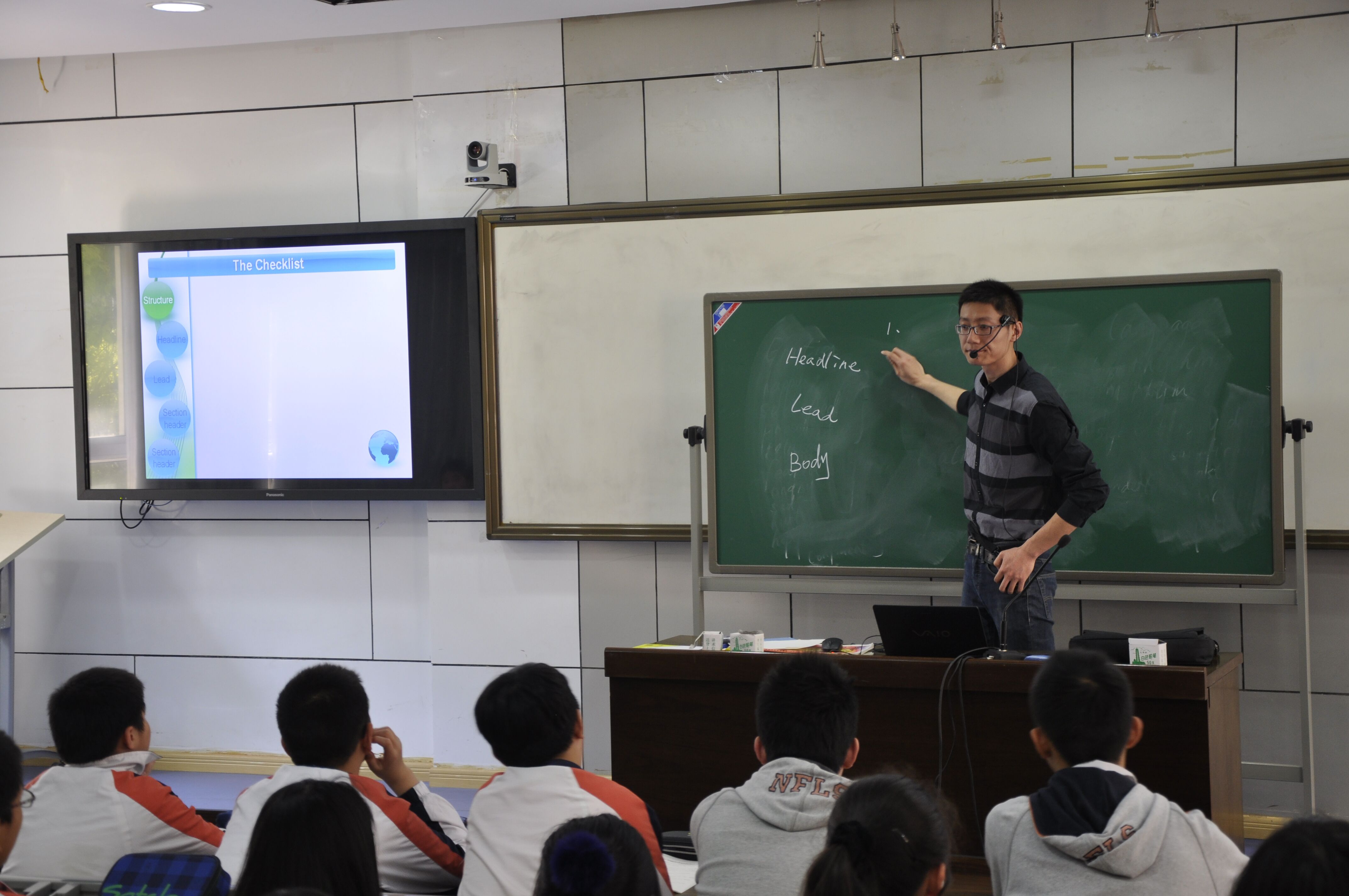 初二年级的侯思成老师展示了一节新闻写作课。侯老师的这节课从社会热点出发,通过简洁的课堂用语,清晰的教学步骤,对新闻标题、导语和正文的写作规则进行了细致的分析和操练。最终着眼于一则叙利亚战地新闻,引导初二的学生进行新闻写作。学生的新闻作品既体现了新闻的严谨和专业性,又反映了学习新闻写作的最终目的:传播信息,引起关注。这样的新闻写作课也提醒坐在课堂里的莘莘学子们,要成为真正的世界公民,得从关心社会、关爱他人开始。