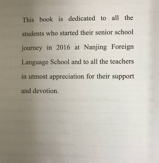 这本展现2016级高一学生智慧和英语水平的优秀书评作品集经历了寒假作业的雏形初现,假期过后全班同学的分享推荐,任课老师的点评修改,艺术老师的封面设计等多个环节,历时3个月终于与大家见面了!恰逢读书节与五四青年节到来之际,我们将这本集体智慧的结晶送给高一年级的全体同学们,愿他们在青春最美好的日子里享受读书带来的快乐!