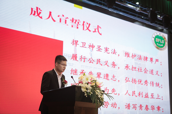 成人仪式上,由2011届优秀毕业生黄鸣阳同学带领学弟学妹们面对国旗庄严宣誓,激励他们积极承担国家和社会的责任。