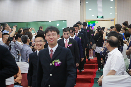 在悠扬的校歌声中,邹正校长一一为毕业生颁发毕业证书并亲切合影,同学们纷纷走向前排,和老师们握手、拥抱,整个会场的气氛达到最高潮。