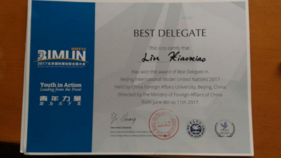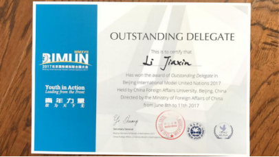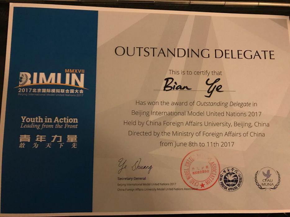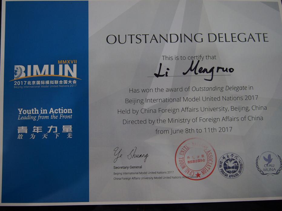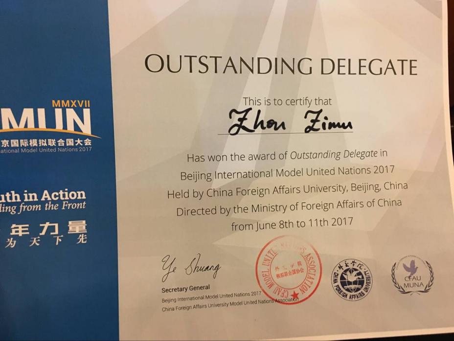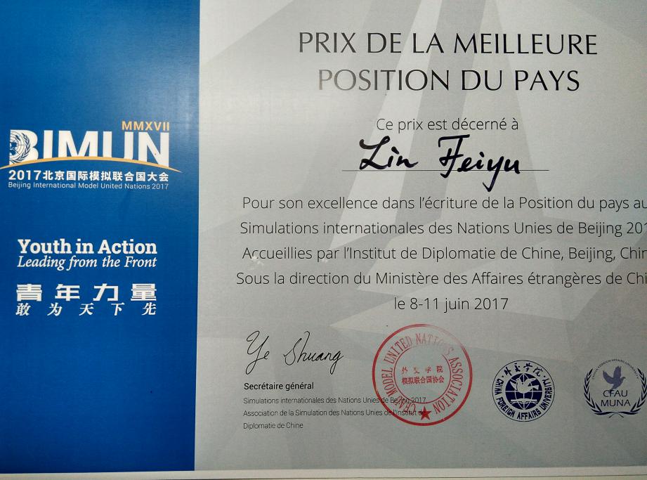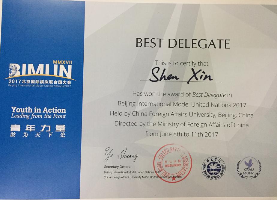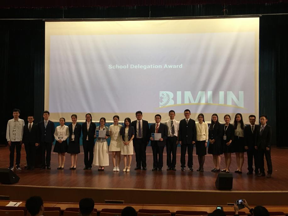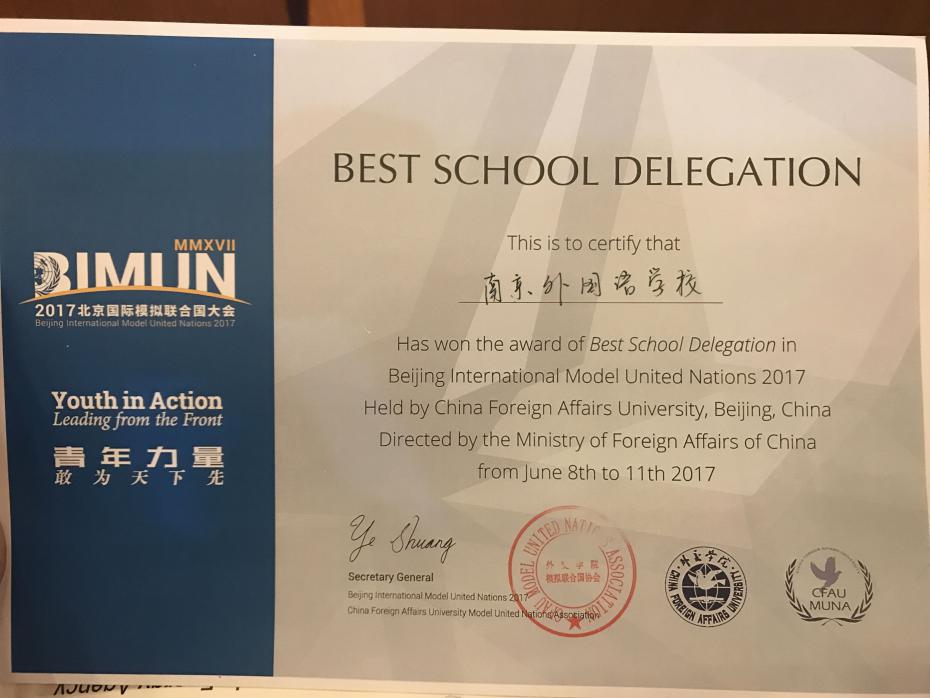 在我校胡雨辰老师的倾力指导下,我校获得了自参加该大会以来的最好成绩。高二(8)班刘晓晓同学荣获“联合国大会第一委员会——裁军和国际安全委员会”最佳代表奖(Best Delegate),高一(8)班沈昕同学荣获“联合国粮食和农业组织”最佳代表奖(Best Delegate),高二(7)班周子木同学、高二(3)班李孟若同学、高二(2)班李佳欣同学、高二(8)班卞格同学荣获“国际原子能机构”杰出代表奖(Outstanding Delegate),高二(6)班林霏雨同学荣获“联合国安全理事会”最佳立场奖(Best Position),高一(8)班吕尚泉同学荣获“联合国难民事务高级专员公署”最佳外交风采奖(Best Diplomacy)。