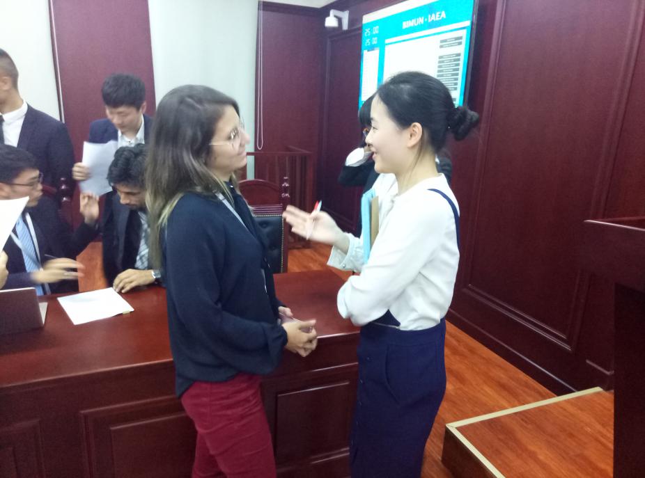 高二(2)班李佳欣同学(右一)与巴西学生代表自由磋商