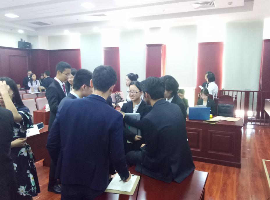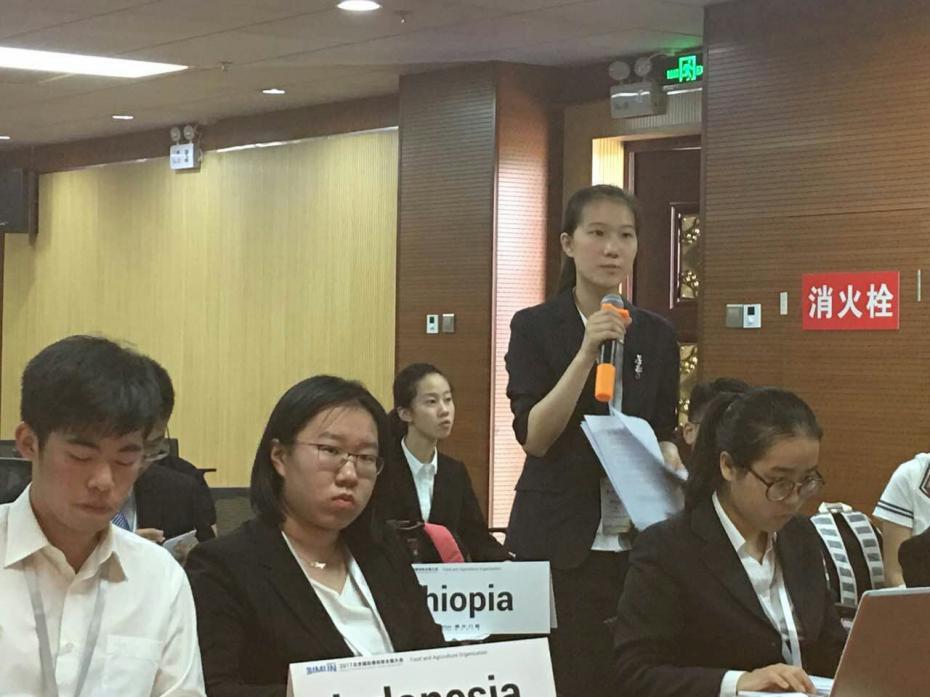 高二(8)班卞格同学(中)与巴基斯坦、菲律宾、韩国学生代表磋商