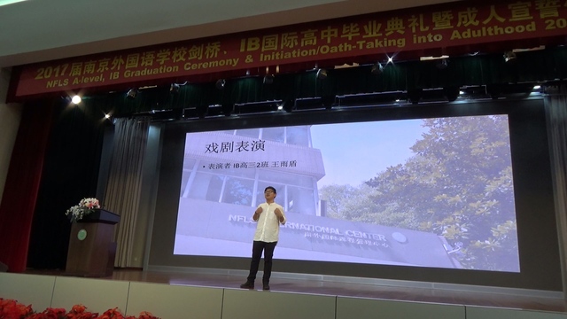 我是来自IB的吴可幻,今天很荣幸能成为南京外国语学校国际部2017届毕业典礼的学生代表发言。首先我想感谢在这三年里老师的指导和家长的关照,也感谢同学们在这条成长的路上和我相互扶持。高中生活转瞬即逝,我们相识的日子似乎还历历在目。在这三年里,我学会了三件让我受益终生的事情,今天在这里我很乐意与大家分享。
