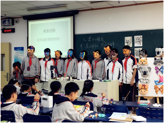 第二节课,侯德怡老师采取猜动物谜语的方式导入新课,激发参与学生兴趣,通过欣赏经典作品,探寻动物的习性与结构特点,让学生通过画动物面具的方式尝试描绘动物的多种表达方式,并进行适当的夸张和变形,学会艺术性的表达,学生乐在其中。