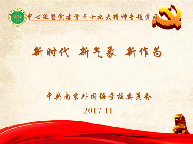 11月13日下午,南京外国语学校党委中心组暨党建骨干,围绕“新时代新气象新作为”,在行政楼508进行了十九大精神的专题学习。校党委书记刘前树系统阐述了十九大的主题和重要意义,从“新方位、新思想、新判断、新方略、新部署”五方面解读十九大精神,同时关注到党章的修改,以及十九大中与教育有关的论述。他希望中心组成员借此机会加深对十九大精神的理解,并在工作中予以落实。