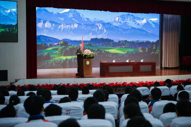 在与高一年级同学的交流过程中,大使先生和同学们分享了他自己关于语言学习的经验和体会。大使先生说,他从小就开始学习德语、法语、英语等多国语言,但是开始阶段却并不顺利,感觉困难重重。然而坚定的信念和长期的坚持帮助他度过了难关,使他在语言学习上如鱼得水,并为后来所从事的外交事业奠定了坚实的基础。在学习过程中,大使先生还接触到了世界各国丰富而多元的文化,这更激发了他学习的兴趣和热情。一次偶然的机会,大使先生遇见了他的夫人---一位中国姑娘,并爱屋及乌地痴迷上了中国文化,也从此与中国结下了不解之缘。从1986年首次访华,三十多年来大使先生多次来到中国,见证了中国改革开放所带来的翻天覆地的变化,并对此赞叹不已。最后,大使先生还向同学们介绍了瑞士高等学府的相关情况,并真诚地欢迎大家前往就读。