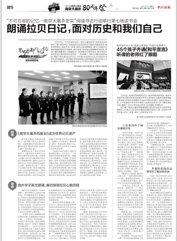 12月10日,"不可忘却的记忆—南京大屠杀史实"阅读寻访活动举办了第7场读书会。本场阅读寻访活动由中共南京市委宣传部、南京市双拥办、南京市文广新局、南京出版传媒集团、侵华日军南京大屠杀遇难同胞纪念馆指导,现代快报、南京报业传媒集团龙虎网、南京广播电视集团少儿频道执行。来自南京外国语学校、南京师范大学的学生代表和周边社区市民,一起观看了《南京大屠杀档案》视频,诵读了英文版《拉贝日记》、中文版《东史郎日记》,中文版《东京审判》节选篇目。活动通过多种语言的记录和描述,再次向世人证明:侵华日军南京大屠杀是铁证如山、不可否认的历史事实。